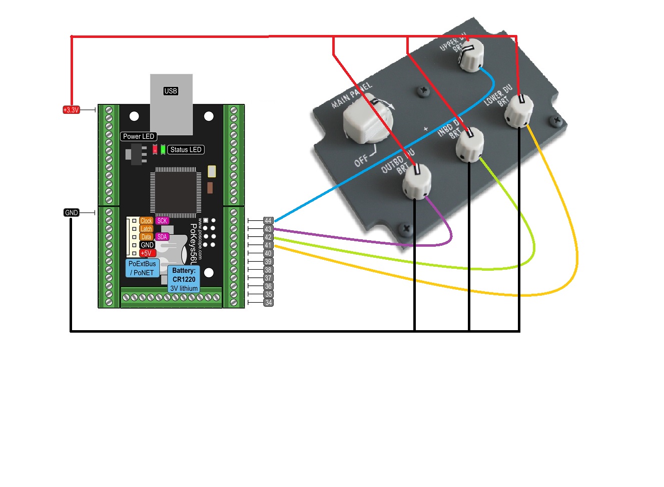 Les 4 potentiomètres LOWER DU BRT, INBD DU BRT, OUTBD DU BRT et UPPER DU BRT seront connectés à une carde Pokeys 56U.
