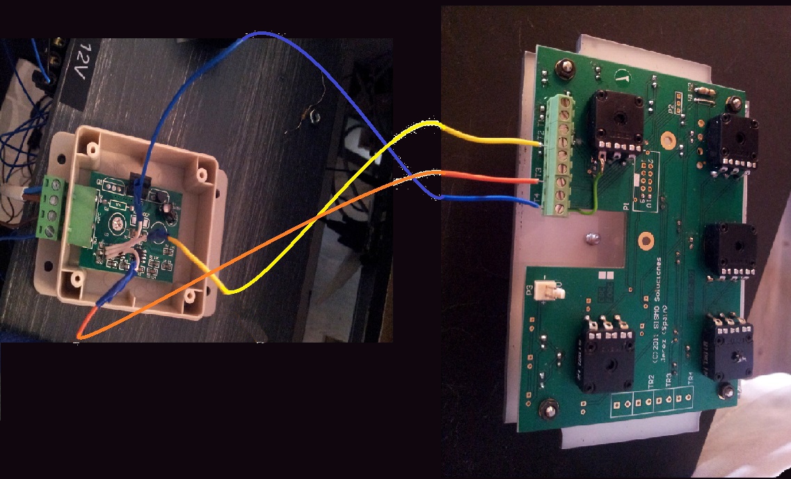 Lorsque l’on démonte le module, on a accès à la carte variateur, le branchement a été effectué comme ceci : Le GND dans le connecteur T4, le + dans le port T3 et le dernier câble dans le port T2