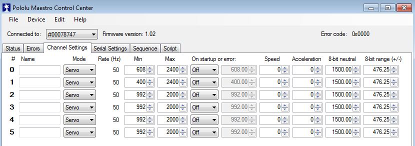Lorsque les servos sont connectés et installés, il faut les calibrer à l’aide du logiciel Pololu Maestro Control Center