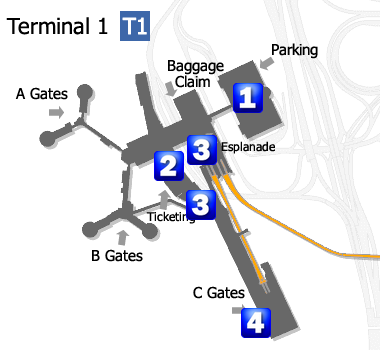 Sur le diagramme de l’aéroport, j’ai identifié notre position en jaune