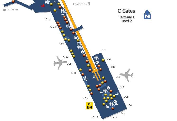 Plan du T1, portes C, on repère la porte C14 de notre avion