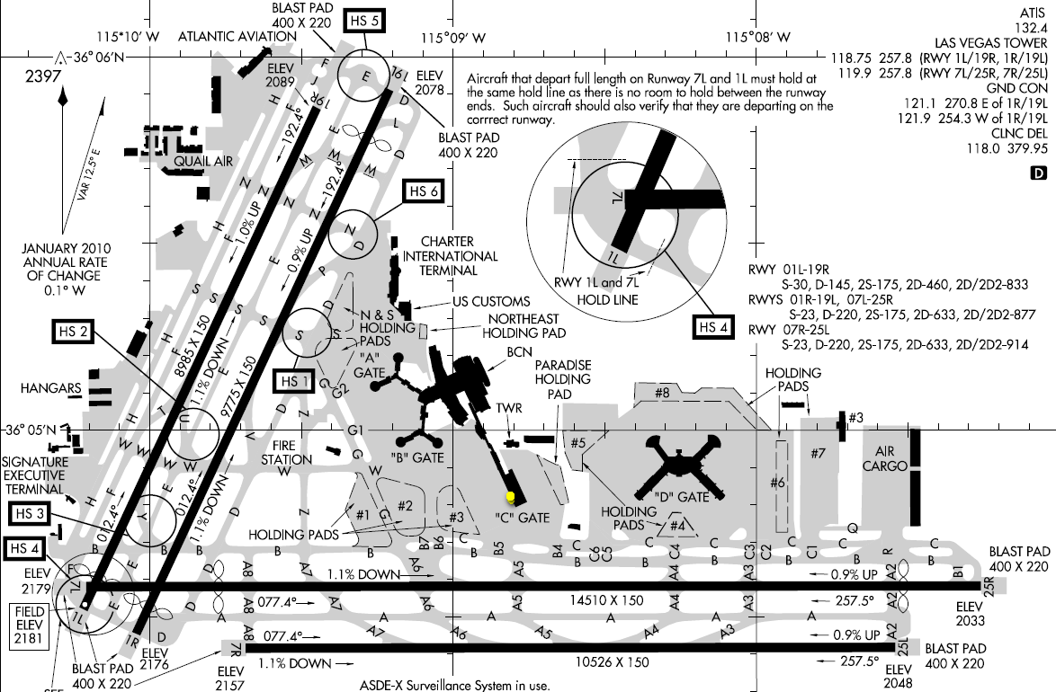 Le METAR est à la date du 6 du mois courant (novembre) à 15h56 zulu time (Las Vegas est a GMT-8 soit 7h56 heure locale), vitesse moyenne de 6 noeuds au cap 200°, la visibilité est de 10 miles (SM: statue miles) soit environ 16km. Aucun nuage sous 12.000 pieds (CLR). La température est de 17° avec un point de rosée à 0°. Pression de 30.31Hg, soit 1026Hpa. Je ne tiens pas compte des remarques (RMK) qui suivent.