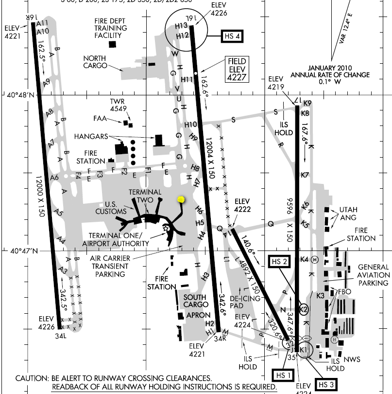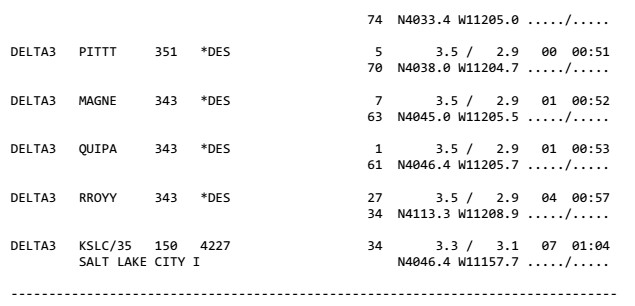 Le METAR est à la date du 6 du mois courant (novembre) à 15h53 zulu time (Salt Lake est a GMT-7 soit 8h53 heure locale), vitesse moyenne de 7 noeuds au 120°, la visibilité est de 10 miles (SM: statue miles) soit environ 16km. Nuages épars, 20.000 pieds. La température est de 7° avec un point de rosée à 1°. Pression de 30.44Hg, soit 1030Hpa.