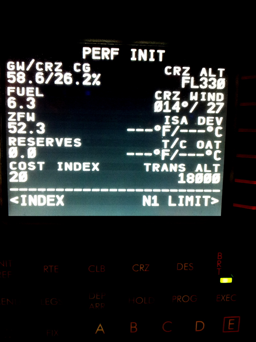 Dans la partie PERF INIT, je saisis l’information du poids de notre avions sans le carburant (ZFW) 52.3t, et j’ai choisis de ne pas avoir de réserve de carburant.