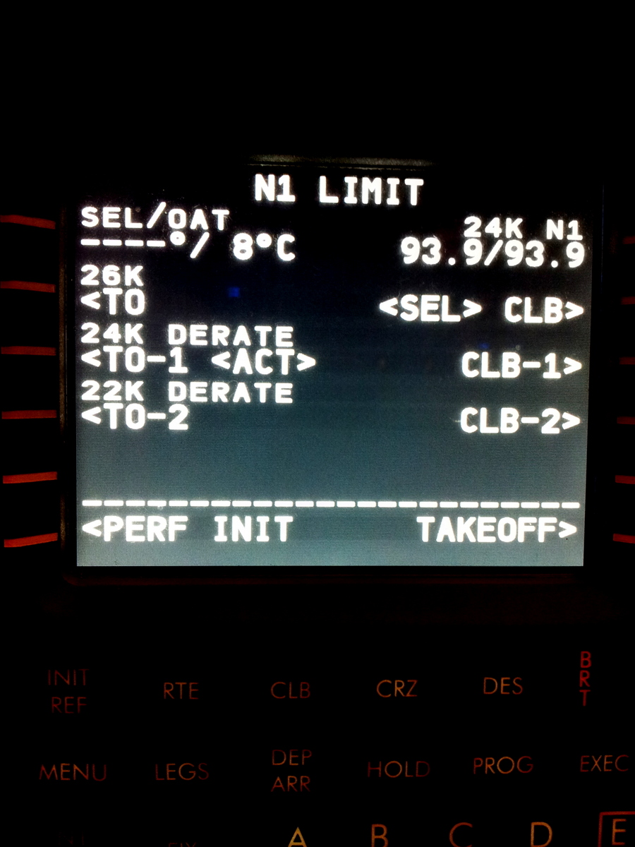 Dans la page N1 LIMIT, je choisis un décollage ‘derated takeoff’ TO-1, cela permettra de ne pas trop précipiter les choses. Ici, c’est un choix personnel et non imposé.