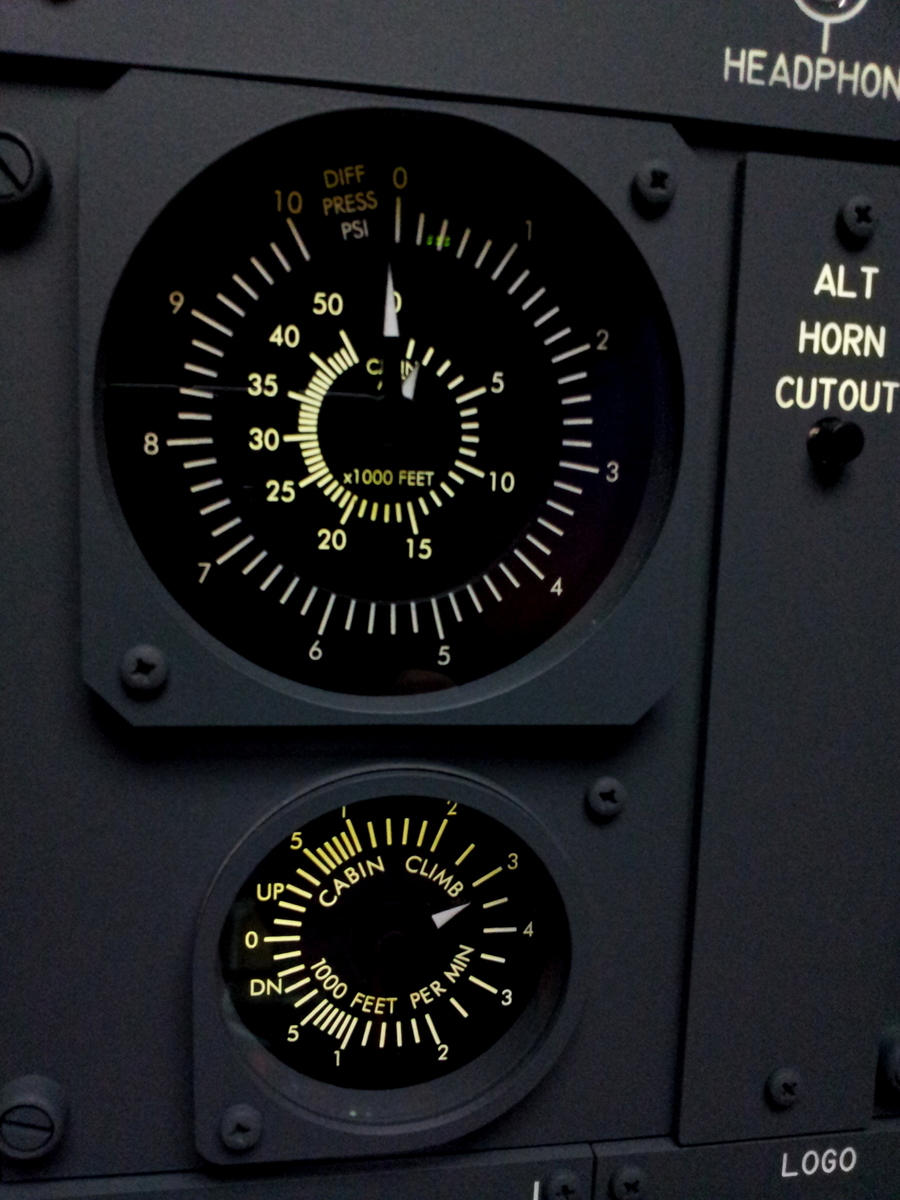 On vérifie l’altitude actuelle de la cabine, un peu plus de 2000 pieds, c’est ok cela correspond à l’altitude de l’aéroport de Las Vegas (2181 pieds). La différence de pression est de 0, c’est ok.