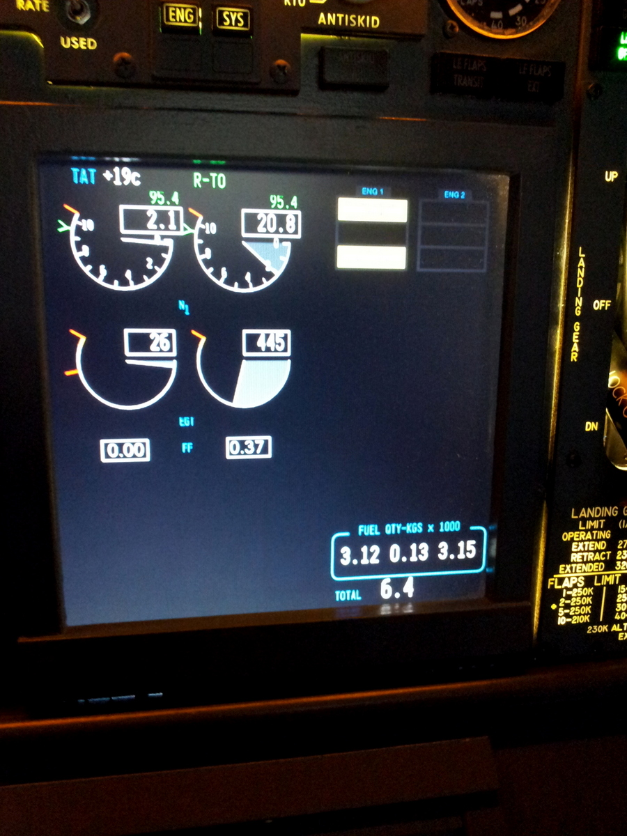 Un petit coup d’œil au flight mode annunciator (FMA), la puissance est réglé sur N1 soit 93.9% comme indiqué dans le FMC sur la page INIT REF et TAKEOFF, le mode Heading Select est actif (cap de la piste 255°) et TO/GA est actif