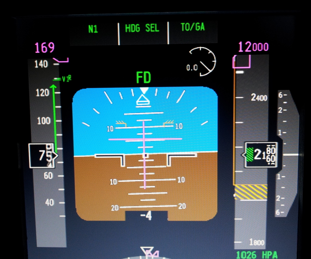 On écoute les annonces de vitesse, V1… nous sommes forcés de décoller, VR….. rotation on tire sur le manche, V2….vitesse de sécurité.