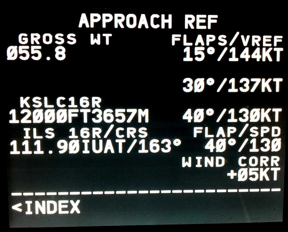 Dans la partie INIT REF du FMC nous sélectionnons une approche avec 40° de volet pour une vitesse de référence de 130 nœuds. On retiens la fréquence ILS de la piste 16R ainsi que son orientation : 111.90 / 163°