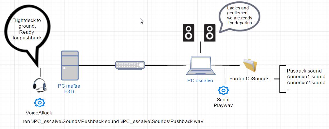 Je recherchais une solution pour jouer des sons (.wav) sur un PC distant. Par exemple lorsque je demande le repoussage à l’équipe au sol, une annonce cabine doit se déclencher sur un autre PC avec les HP derrière moi.