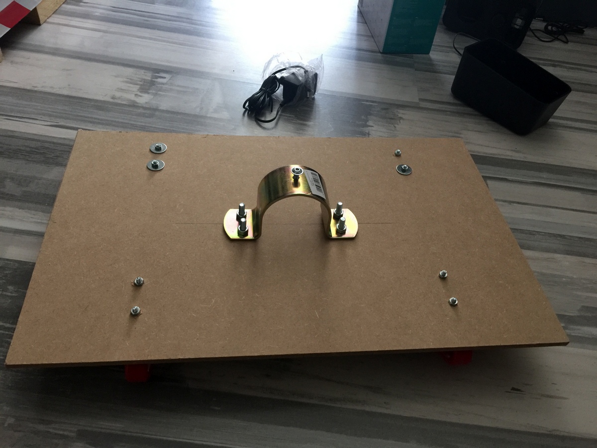 Le pied est constitué d’un pied de table en alu vissé sur un support lui-même vissé sur la plateforme.
