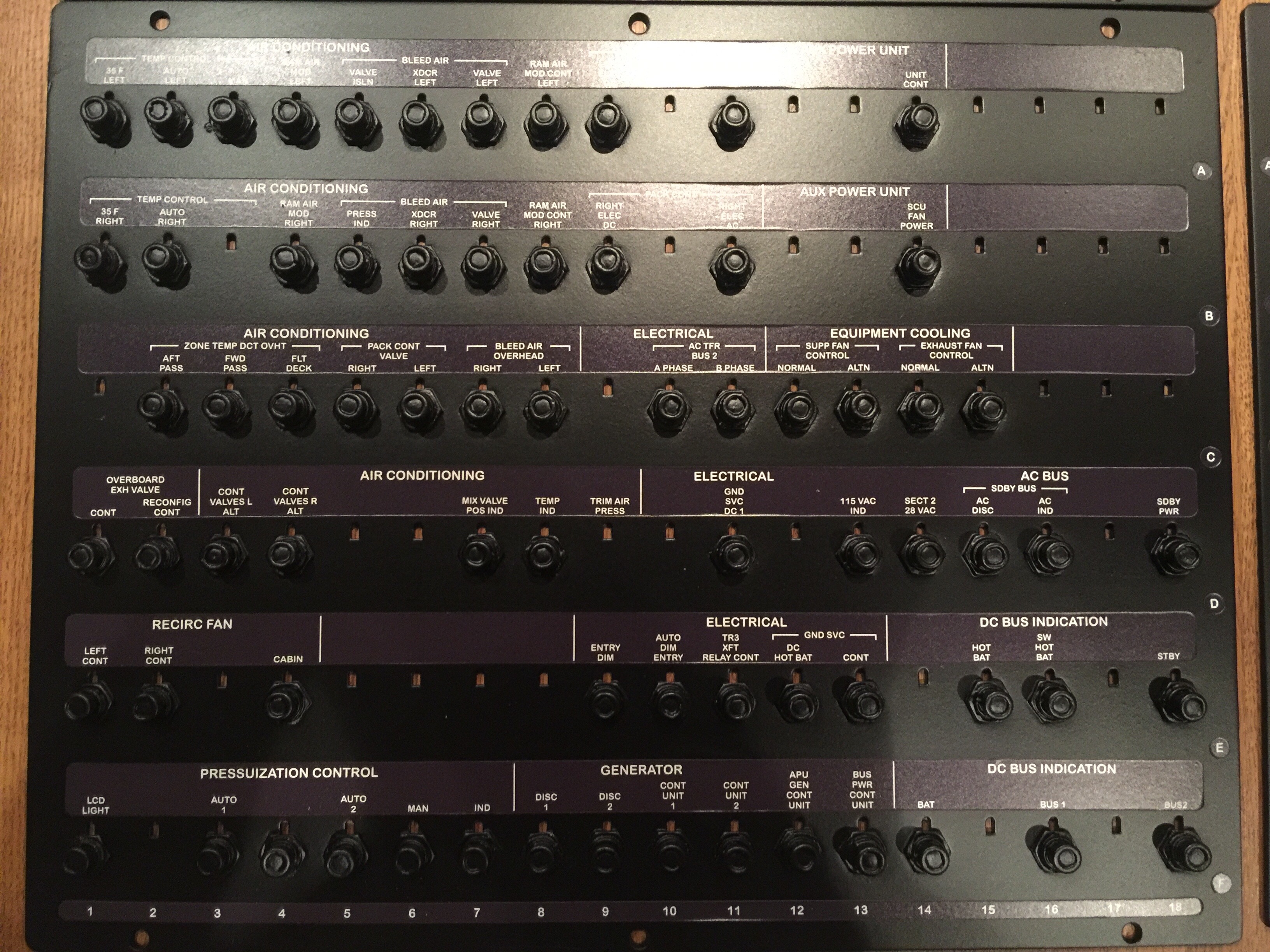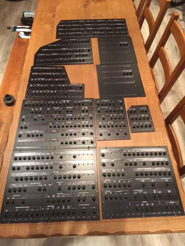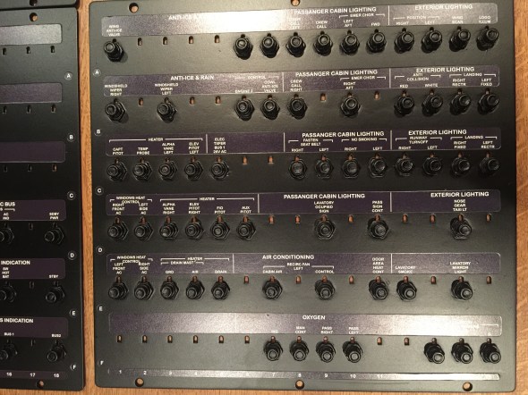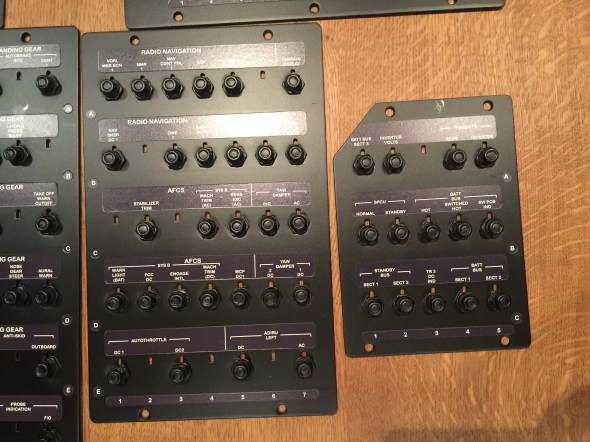 Que de chemin parcouru cette année, de très belles évolutions avec le déménagement du cockpit dans une pièce dédiée, l’ajout du shell intérieur, le remplacement des modules du pedestal par ceux de Cpflight, l’ajout de l’AFT overhead et pleins d’autres petits détails pour finir en beauté avec les derniers éléments ci-dessous reçus de http://www.luxsimprojects.com/ : les panels complets de tous les breakers et les 2 parois qui viendront fermer la structure de chez FlyByCockpit.