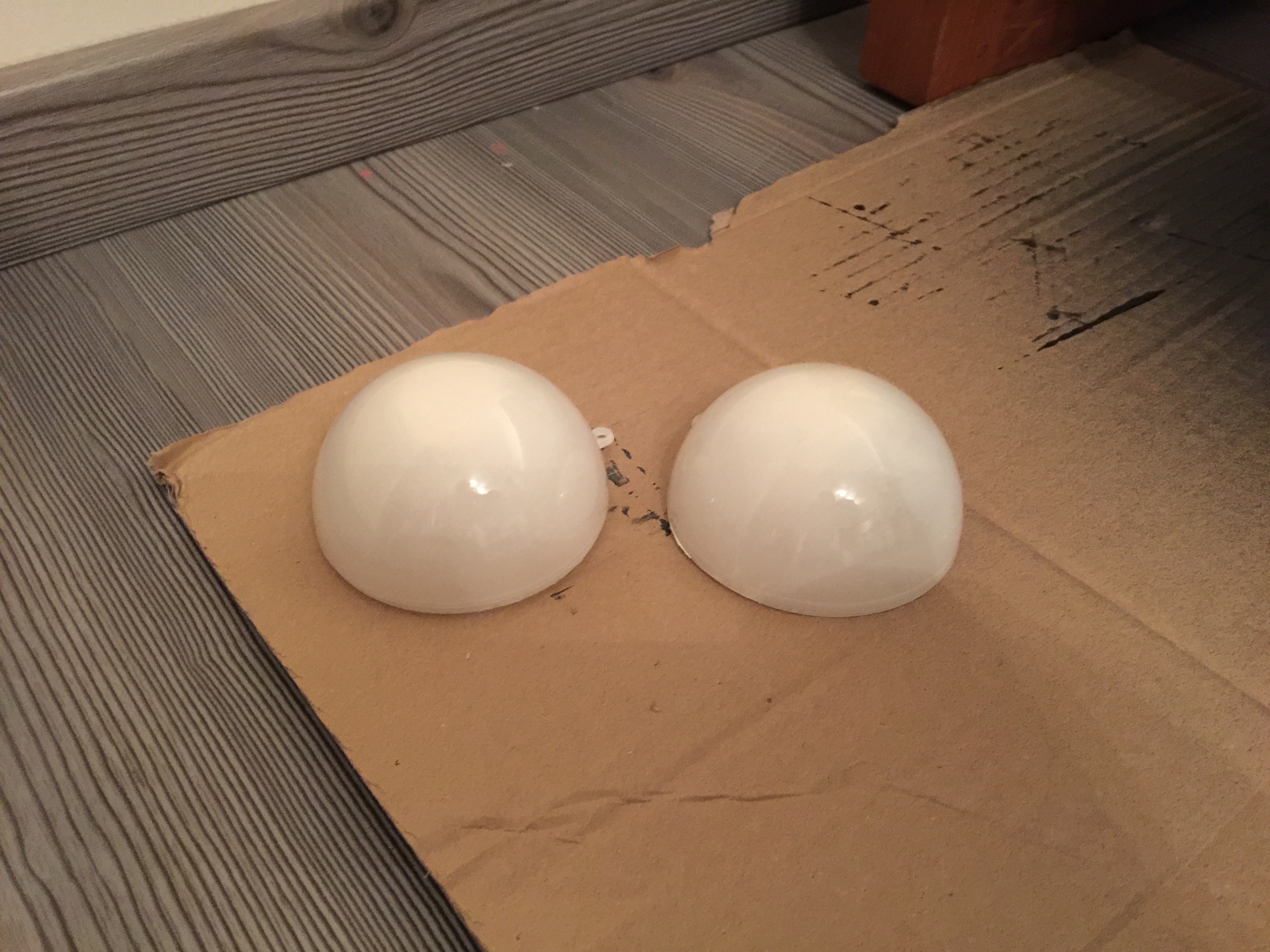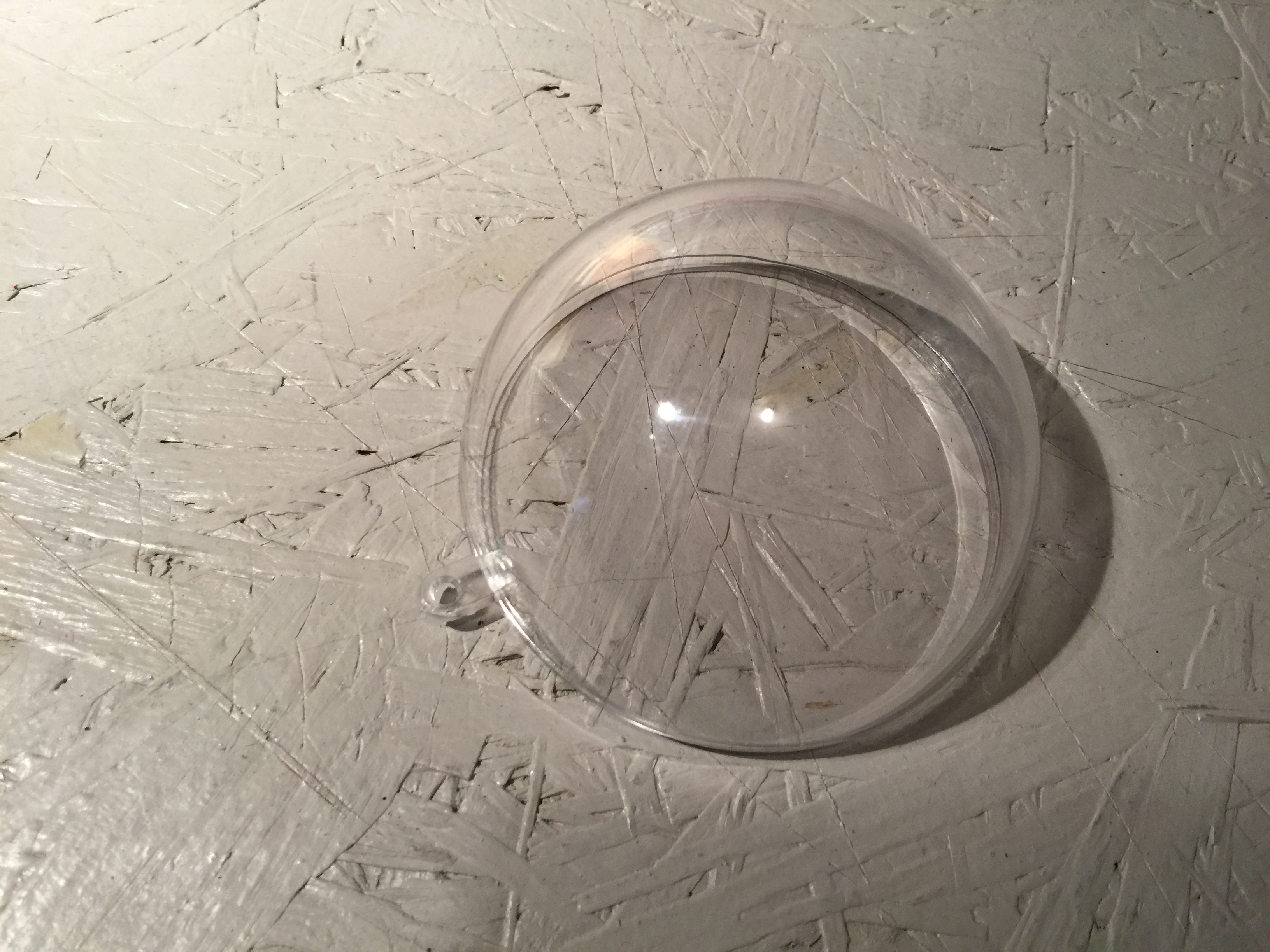 Pour cela j’ai utilisé une boule en plastique transparent qui est utilisée pour de la déco et qui se sépare en 2. Le diamètre de la boule est de 8cms