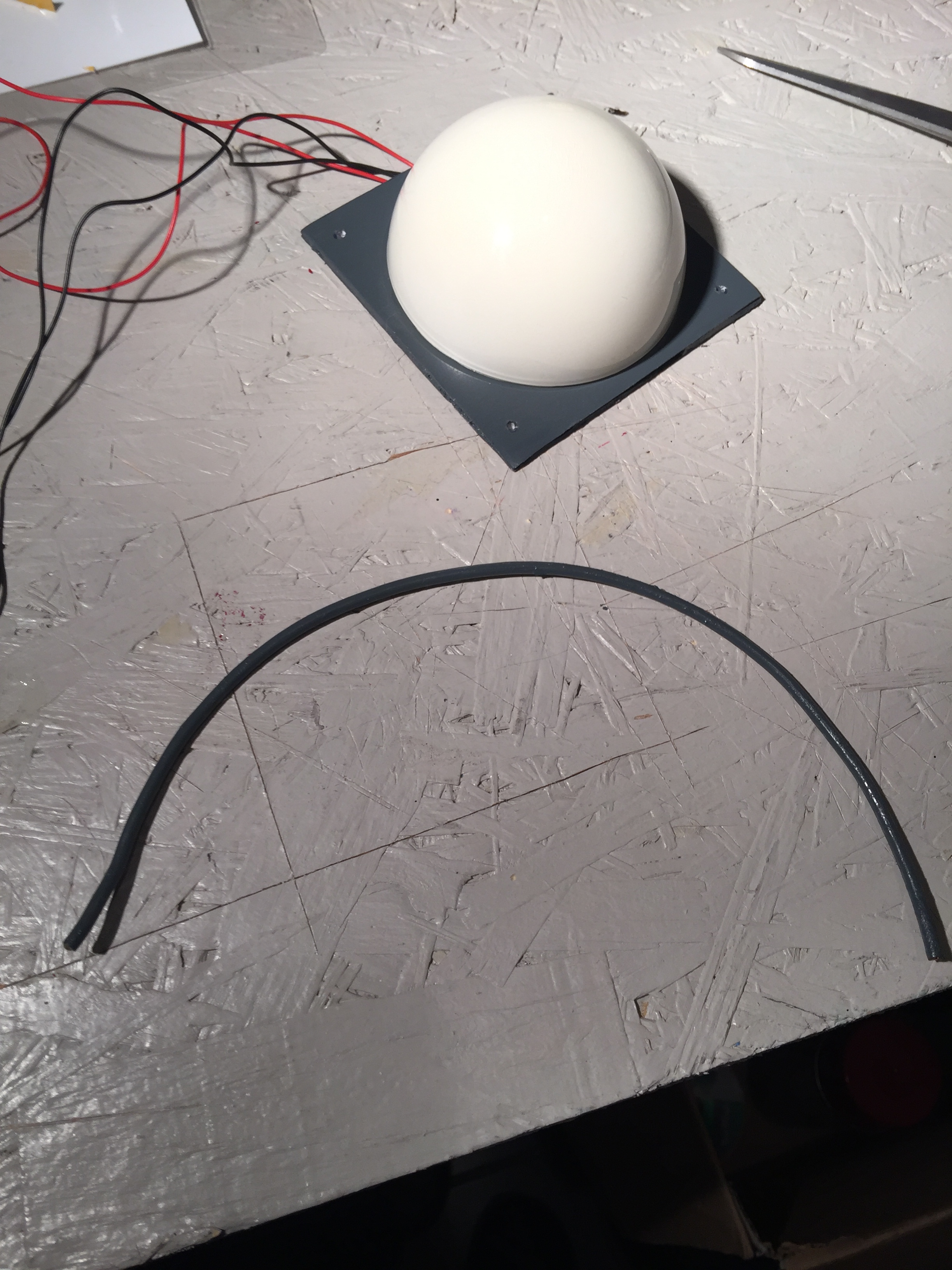 Dernière étape pour la finition, un câble souple électrique que j’ai peint de la même couleur que le support et qui vient se coller tout autour du dome