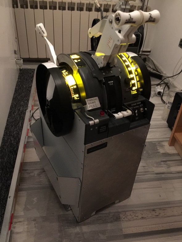 J’ai maintenant eu l’occasion de faire plusieurs vols avec ce trhottle et j’en suis hyper statisfait. Je n’aurai q’un reproche, les manettes de reverse sont connectées à des switches et non des potentiomètres comme mon ancien throttle, du coup pour la puissance des reverses c’est tout ou rien, et quand on coupe les reverses la descente du régime moteur n’a pas le temps de revenir sur idle du coup on se retouve en poussée le temps de la déscente du régime. Pour un throttle de cette catégorie, je trouve ça dommage.