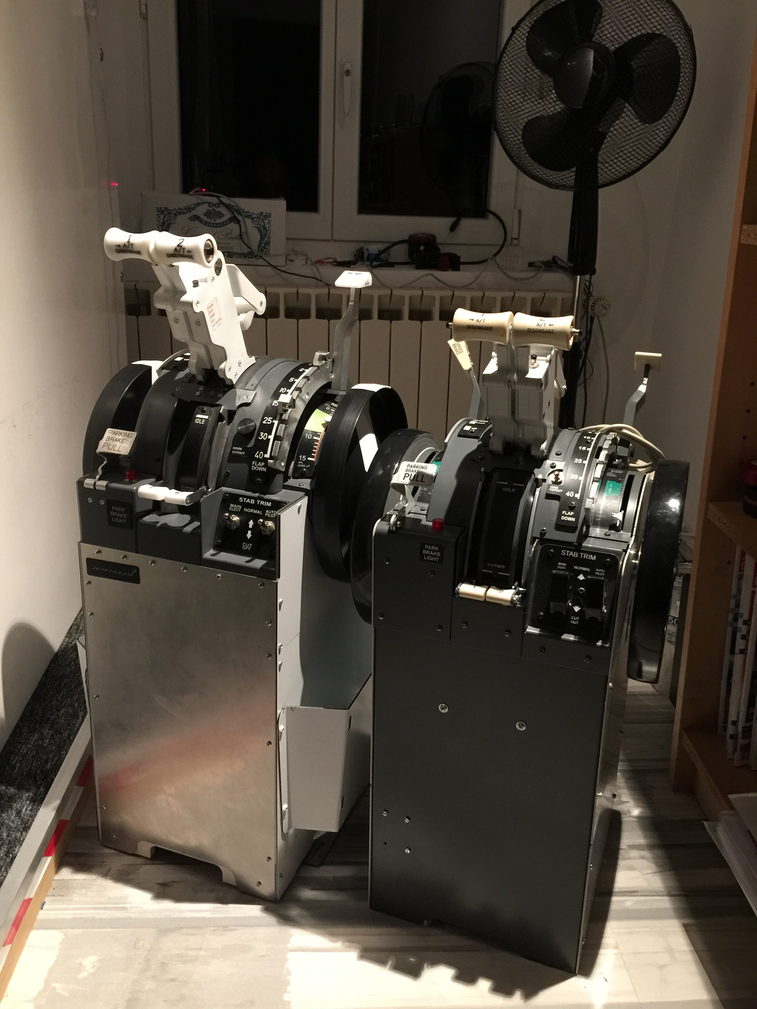 J’ai maintenant eu l’occasion de faire plusieurs vols avec ce trhottle et j’en suis hyper statisfait. Je n’aurai q’un reproche, les manettes de reverse sont connectées à des switches et non des potentiomètres comme mon ancien throttle, du coup pour la puissance des reverses c’est tout ou rien, et quand on coupe les reverses la descente du régime moteur n’a pas le temps de revenir sur idle du coup on se retouve en poussée le temps de la déscente du régime. Pour un throttle de cette catégorie, je trouve ça dommage.