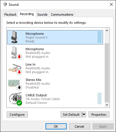 - Ensuite aller dans la partie Son de Windows et dans l’onglet Recording/Enregistrement choisir la 1ére source, ici un de mes modules FlightSoundX