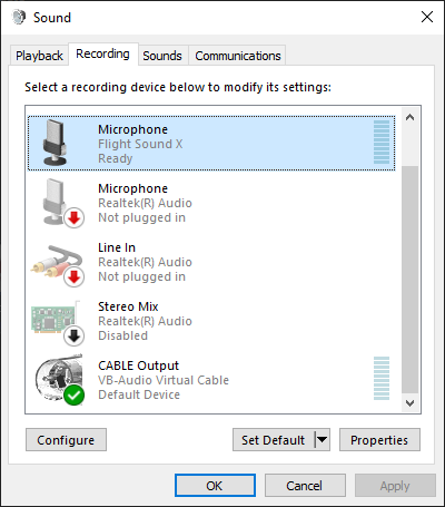 - Ensuite aller dans la partie Son de Windows et dans l’onglet Recording/Enregistrement choisir la 1ére source, ici un de mes modules FlightSoundX