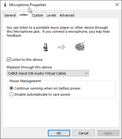 - Dans le menu déroulant Playback through this device/Lire sur ce périphérique, choisir le périphérique CABLE input(VB-Audio Virtual Cable) et cliquer sur OK