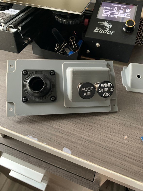 Les 2 boutons FOOT AIR et WINDSHIELD AIR ont été conçu pour être imprimé en 2 couleurs, je souhaitais pouvoir imprimer directement avec les lettres blanches sur les boutons sans avoir à utiliser d’autocollant, peinture, ou autre.